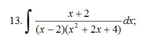 int  frac{(x+2)dx}{(x-2)(x^2+2x+4)} =I\\ frac{x+2}{(x-2)(x^2+2x+4)} = frac{A}{x-2} + frac{Bx+C}{x^2+2x+4} = frac{A(x^2+2x+4)+(Bx+C)(x-2)}{(x-2)(x^2+2x+4)} \\x+2=A(x^2+2x+4)+(Bx+C)(x-2)\\x+2=(A+B)x^2+(2A-2B+C)x+(4A-2C)x^0; ,; ; [x^0=1]\\x^2; |, A+B=0,; ; to ; ; A=-B\\x; |; 2A-2B+C=1,; ; to ; ; C=1+4B,\\x^0; |; 4A-2C=2,; ; to ; ; -2B-C=1,; C=-2B-1\\-2B-1=1+4B; ; to ; ; 6B=-2,; B=-frac{1}{3}\\A=frac{1}{3},; ; C=-frac{1}{3}