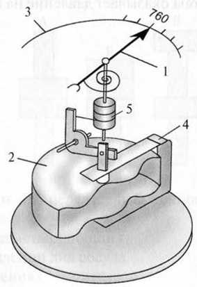 Барометр-анероид представляет собой герметически закрытую металлическую коробочку А. Воздух из коробочки откачан. Для того чтобы ее не раздавило, поверхность коробочки делают волнистой. С ней соединяют стальную пружину 4, которая в данном случае имеет форму пластины.