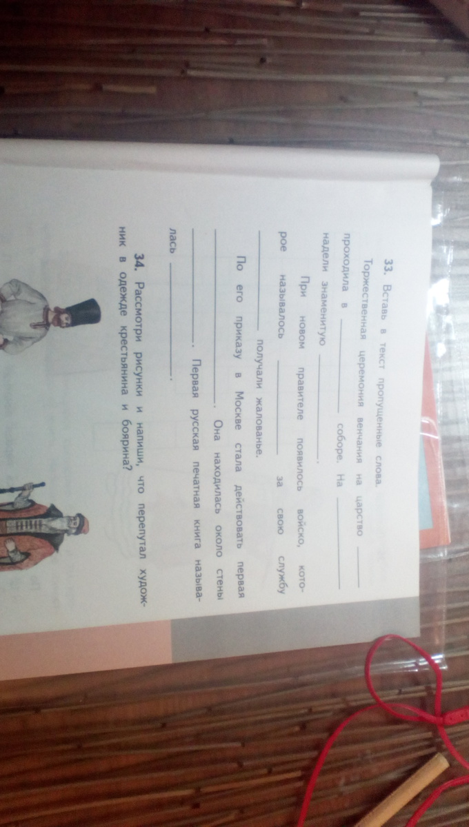 Торжественная церемония венчания на царство __ИВАНА IV___ проходила в __УСПЕНСКОМ___ соборе КРЕМЛЯ. На _ГОЛОВУ ВОЗЛОЖИЛИ_ (надели) знаменитую __ШАПКУ МОНОМАХА__. При новом правителе появилось войско, которое называлось_СТРЕЛЬЦЫ__ за свою службу получали __ИЗ КАЗНЫ ДЕНЕЖНОЕ И ХЛЕБНОЕ__ жалованье. По его приказу в Москве стала действовать первая _____ ? (ВОЗМОЖНО ИМЕЕТСЯ ВВИДУ ОПРИЧНИНА)_____.Она находилась около стены ____ ? ____. Первая русская печатная книга называлась АПОСТОЛ__.