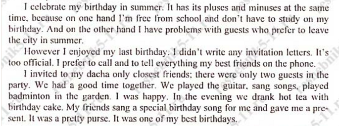 отмечать свой день рождения летом. Она имеет свои плюсы и минусы в то же потому, что на один раз передать l'м свободное от школы и не должны учиться на моем с другой стороны, у меня есть проблемы с гостями, которые предпочитают уехать летом. Тем не менее пользовался мой последний день рождения. не писал письма-приглашения. Это официально. Я предпочитаю, чтобы позвонить и сказать все мои лучшие друзья по телефону. л пригласил к себе на дачу только closcst друзьям: там было только два гостей в партии. Мы хорошо провели время вместе. Мы играли на гитаре. пел песни. бадминтон в саду. был счастлив. Вечером мы пили горячий чай с торт ко дню рождения. Мои друзья спели специальную песню ко дню рождения для меня и дал мне предпусковой Это был довольно кошелек. Это был один из лучших моих дней рождения.