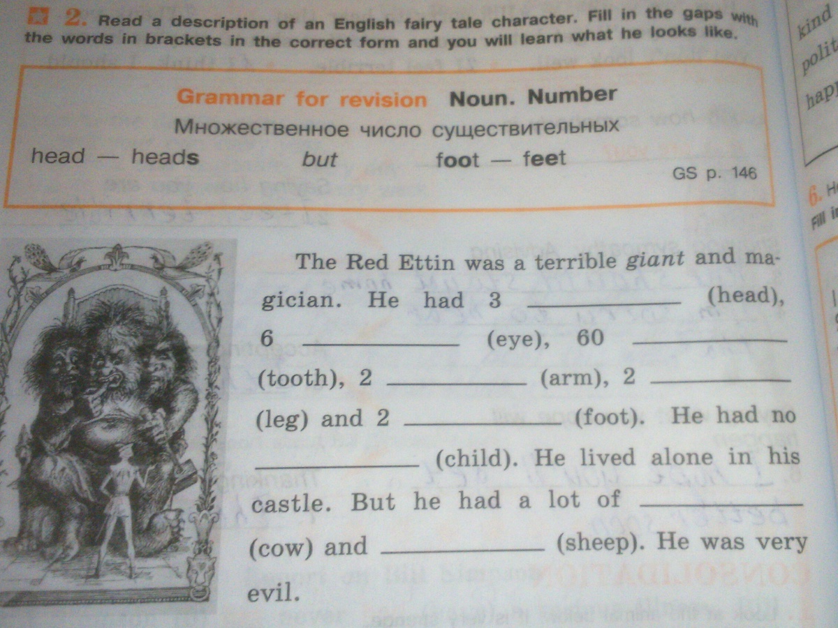He had 3 heads, 6 eyes, 60 teeth, 2 arms, 2 legs and 2 feet. He had no children. .......... But he had a lot of cows and sheep.