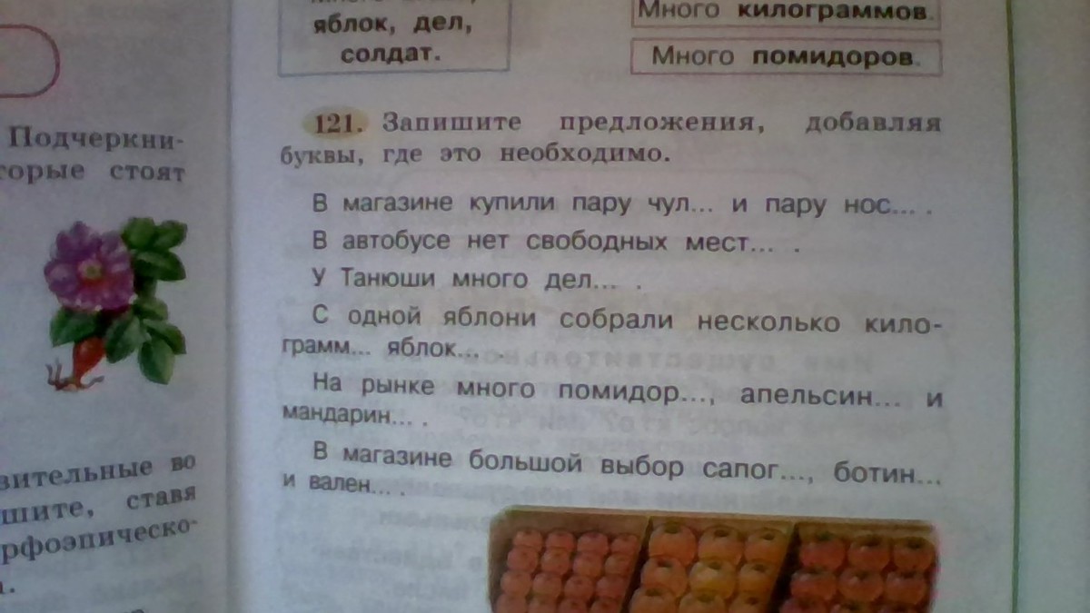 В магазине купили пару чулков и пару носков. В автобусе нет свободных мест. У Танюши много дел. С одной яблони собрали несколько килограмм яблок. На рынке много помидоров,апельсинов и мандаринов. В магазине большой выбор сапогов,ботинок и валенок. Вроде так