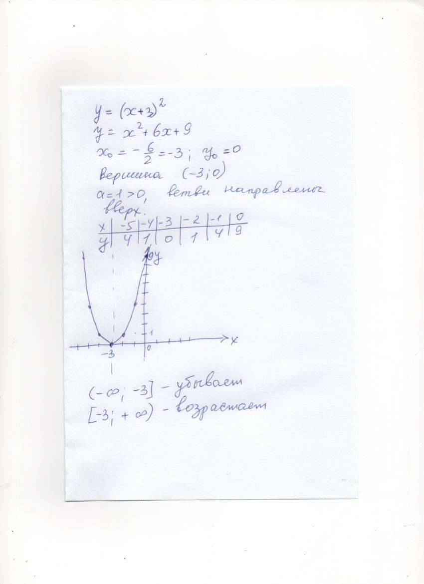 Постройте график функции y=(x+3)2 .Укажите промежутки возрастания и убывания функции.