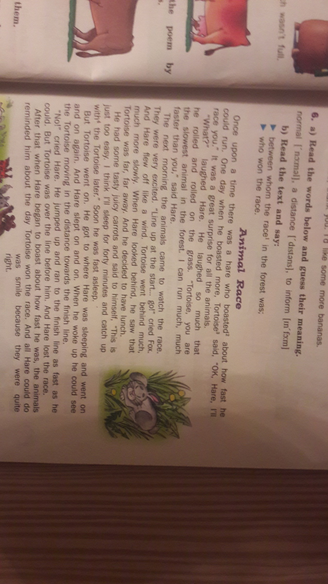 Следующим утром животные пришли посмотреть на гонку. Они были очень взволнованы."Выстраивайтесь на старте... пошли!"-крикнул лис. И заяц полетел как ветер.Черепаха шла позади намного медленнее. Когда заяц посмотрел назад (обернулся) , он увидел что черепаха далеко-далеко позади. И он решил пообедать. У него было несколько вкусных сочных морковок и он сказал себе: " Это слишком легко. Я посплю 4 минуты и догоню черепаху позже. Затем он крепко уснул. Но черепаха продолжала идти. Она дошла до того места, где спал заяц и продолжала идти дальше. А заяц все спал и спал. Когда он проснулся, он увидел , что черепаха прямо перед финишной чертой. "НЕТ!"-закричал заяц. Он подпрыгнул и побежал к финишу так быстро, как только мог. Но черепаха перешла финишную линию. Заяц проиграл гонку. После этого, каждый раз, когда заяц хвастался, как быстро он может бегать, животные напоминали ему о гонке, когда черепаха победила его. И все ,что заяц мог сделать, это только улыбаться, ведь они были правы.