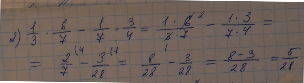 1/3*6/7=2/7 - 1/7*3/4=3/28 = приводим к единому знаменателю 28