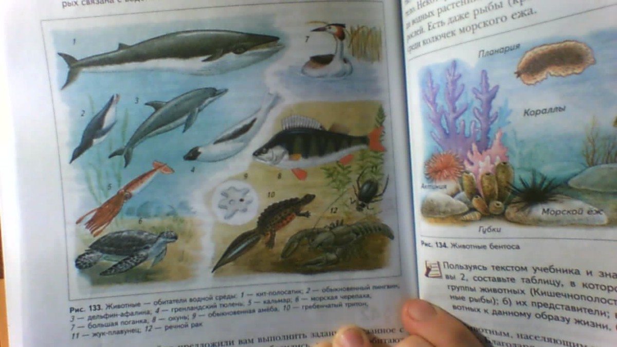 используя рисунок 133, где изображены представители разных типов животных, обитающих в водной среде, ответьте не вопрос: какие из изображенных животных используют в своей жизни и наземно-воздушную среду обитания?