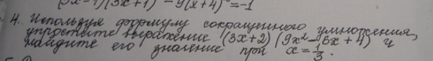 (3х + 2)(4х в квадрате -6х +4) =(27х в кубе +8) Подставим значение = 1/3 получим 27 умножить на 1/27 +8=9.