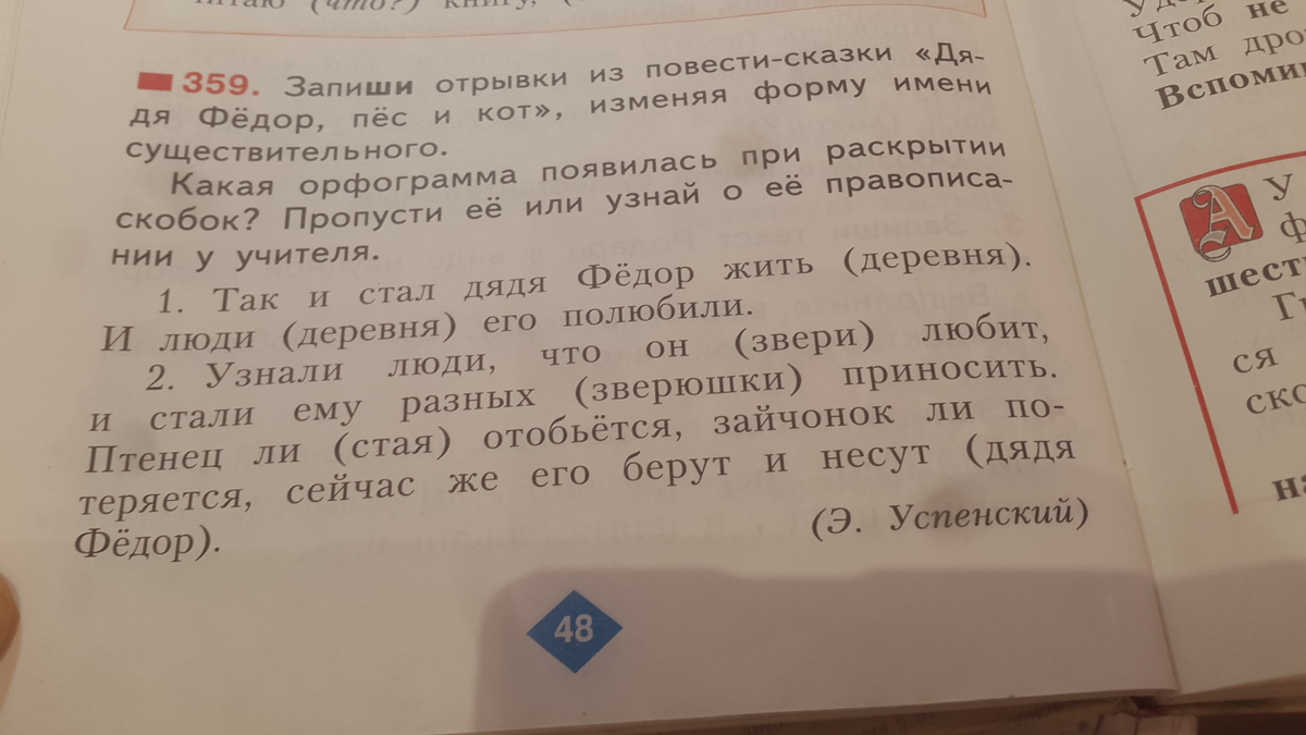 так и стал Дядя Федя жить в деревне. И люди в деревне его полюбили. Узнали люди, что он зверей любит, и стали ему разных зверюшек приносить. Птенец ли от стаи отобьётся, зайчонок ли потеряется, сейчас же его берут и несут дяде Федору