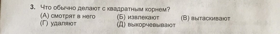 3. Что обычно делают с квадратным корнем ?(А)смотрят в него (Б)извлекают (В)вытаскивают (Г)удаляют (Д)выкорчевывают