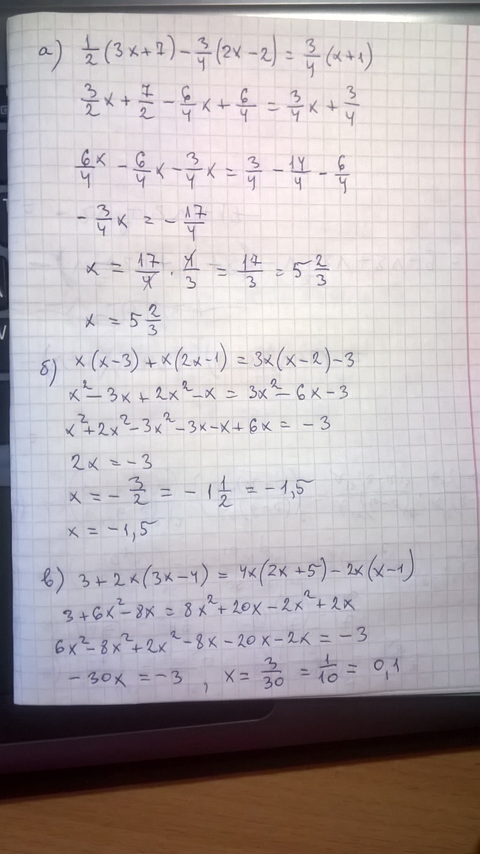 Решите уравнение А)1/2(3x+7)-3/4(2x-2)=3/4(x+1)=? Б)x(x-3)+x(2x-1)=3x(x-2)-3 =?