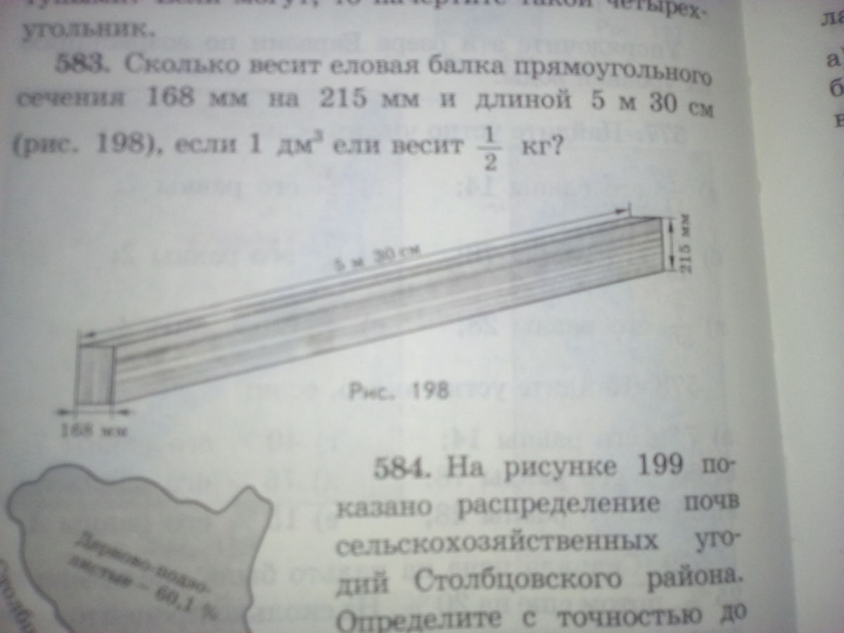 Сколько весит еловая балка прямоугольного сечения 168 мм на 215 мм и длиной 5 м 30 см(рисунок на фотке), если 1 дм³ ели весит ½ кг?