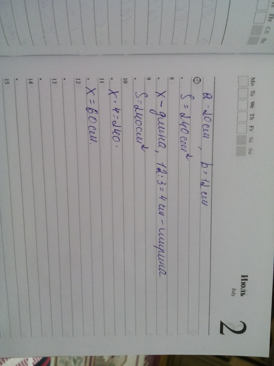 Длина прямоугольника 20 сантиметров а ширина 12 сантиметров Найдите длину прямоугольника с такой же площадью если его ширина в 3 раза меньше ширины первого прямоугольника. Решить задачу уравнением.