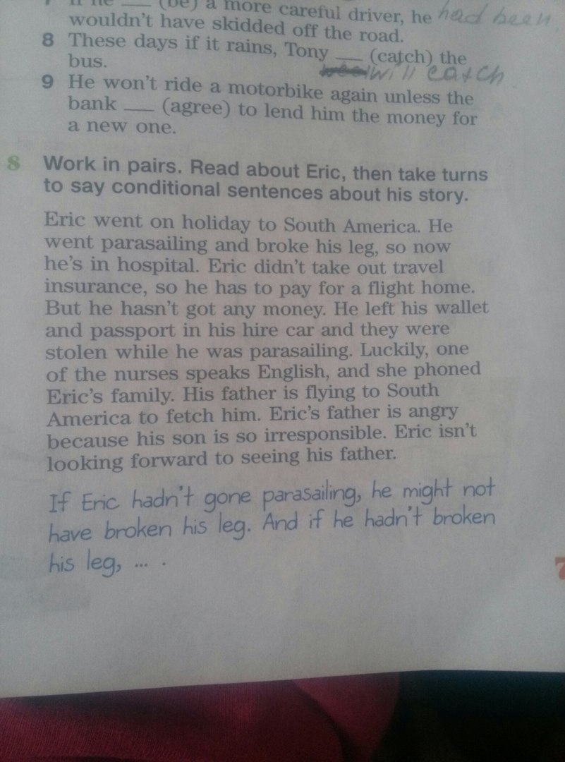 ....And if he hadn't broken his leg,he would have not laid in the hospital.If Eric hadn't taken out his travel insurance, he would have paid for flight home.If he hadn't left his wallet and pasport ,he would haven't had his documents stolen ,while he was parasailing. If neither of the nurses hadn't spoken English , they would have not got in touch with Eric's parents. Therefore, if the nurse hadn't called to Eric's family, his father probably would has not flew to South to fetch Eric. Eric's father would hasn't been so fuming (angry) by the meeting , if Eric had been more responsible. Eric would has been looking forward to see his dad if he hadn't been so angry at him.))