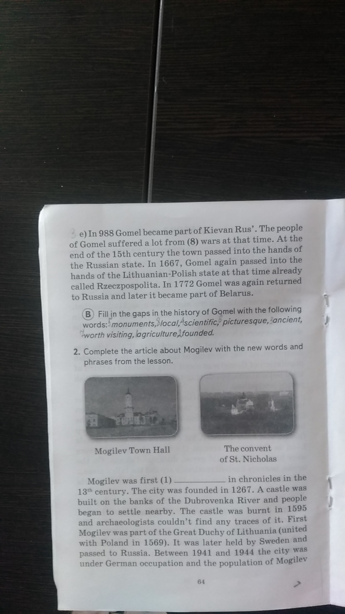 е) В 988 году Гомель стал частью Киевской Руси. В то время жители Гомеля прошли через множество войн. В конце 15-ого века город перешел в руки Российского государства. В 1667 году Гомель снова перешел в руки Польско-Литовского государства, которое в то время называлось Речью Посполитой. В 1772 году Гомель снова стал частью России, а позже - частью Белоруссии.