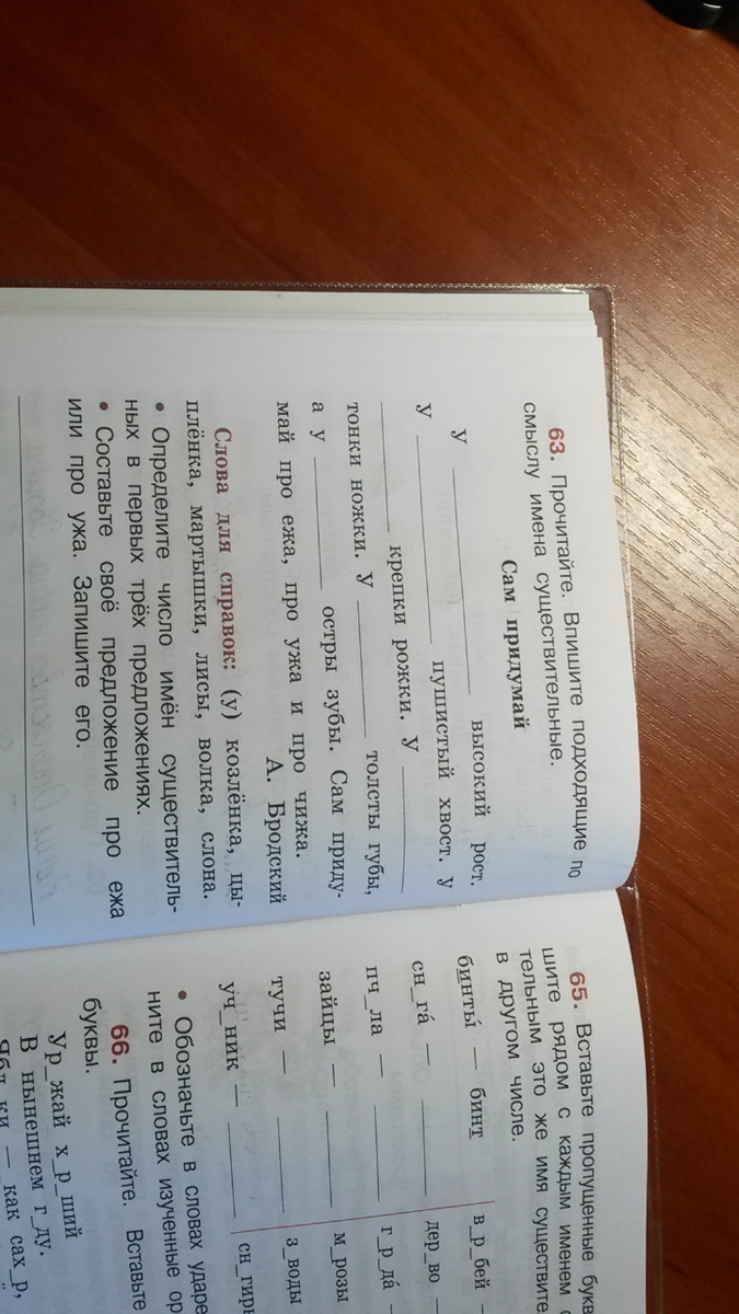 У слона высокий рост. У лисицы пушистый хвост. У козлёнка крепки ножки. У цыпленка тонки ножки. У мартышки толсты губы, а у волка остры зубы.