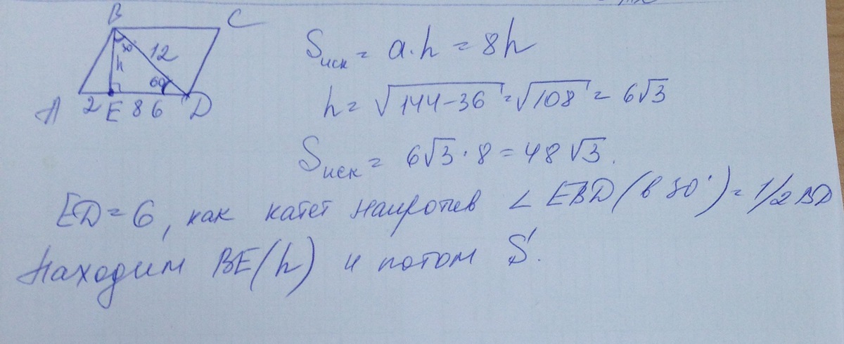 диагональ параллелограмма 12 см образуя угол 60 градусов с стороной, равной 8 см. Найдите площадь параллелограмма