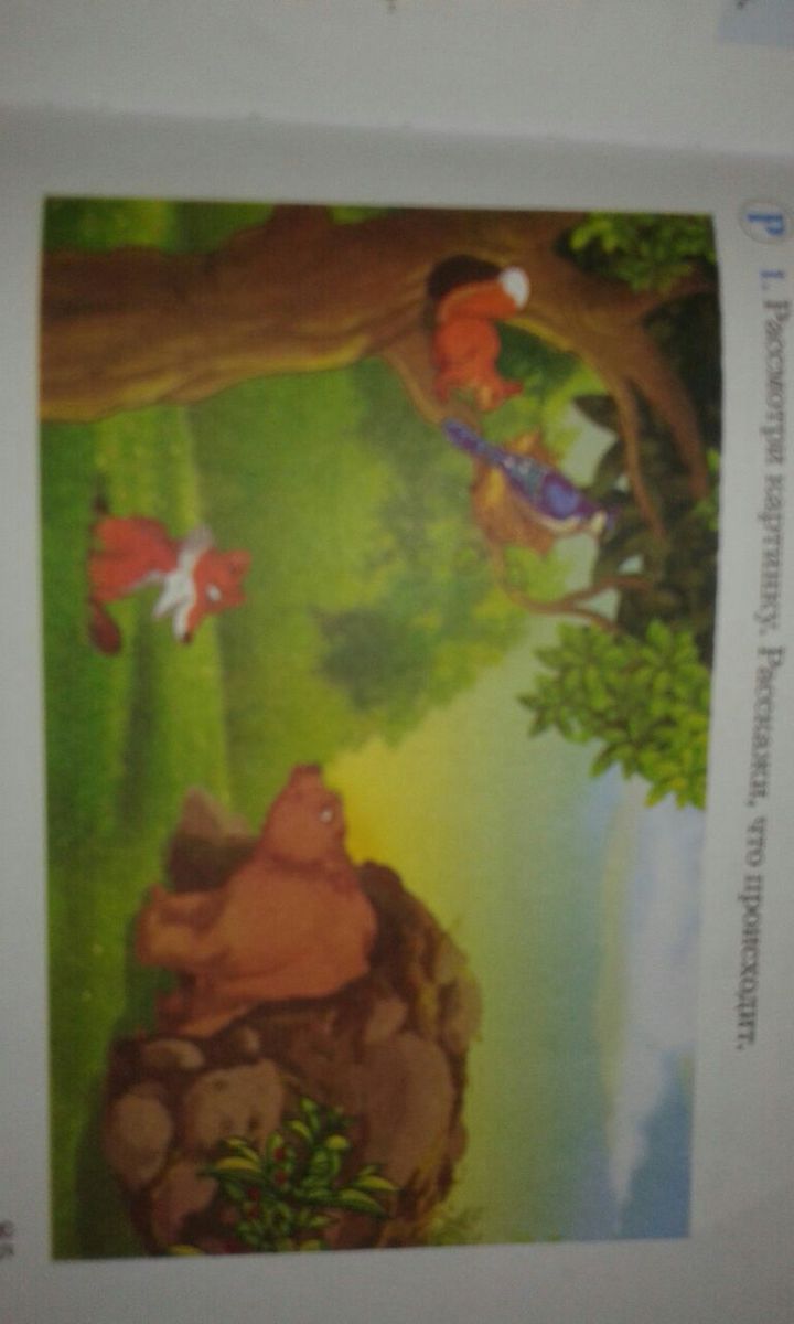 Медведь вылзиит из пещеры, птица сидит в гнезде, белочка сидит на ветке, а лиса мне кажется закопалась на половину в землю.