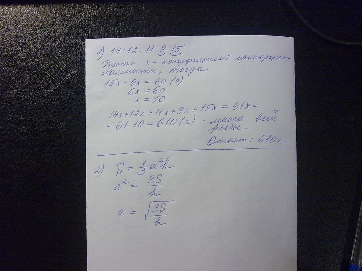 1.Рыбу разрезали на пять кусков в отношении по массе 14:12:11:9:15. Причем самый тяжелый кусок на 60 г тяжелее самого легкого кусочка. Найдите массу всей рыбы. 2.Выразите из формулы объема пирамиды V = ( ДРОБЬ 1/3) а ( в квадрате) * h длину стороны а.