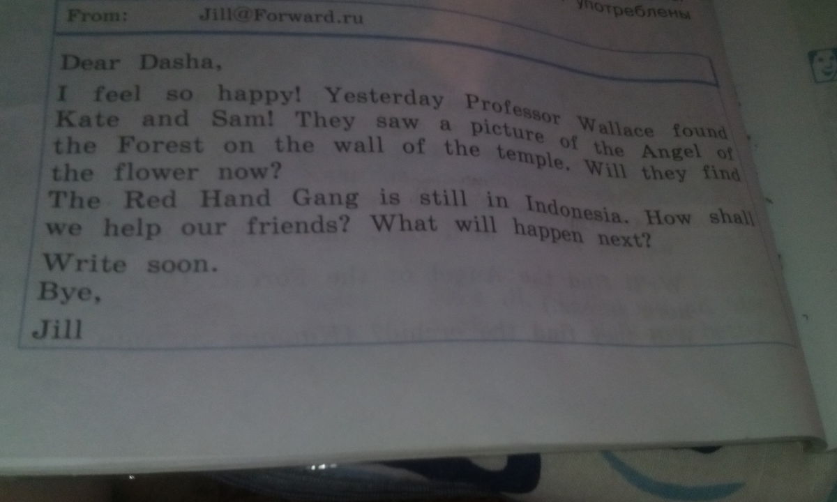 Я так счастлив. Вчера профессор Вэллис нашел Кейт и Сэм! Они увидели картину Ангела леса на стене храма. Найдут ли они цветок сейчас? Банда Красная Рука все еще находится в Индонезии. Как нам помочь нашим друзьям? Что будет дальше? Напиши мне в ближайшее время, пока. Джилл.