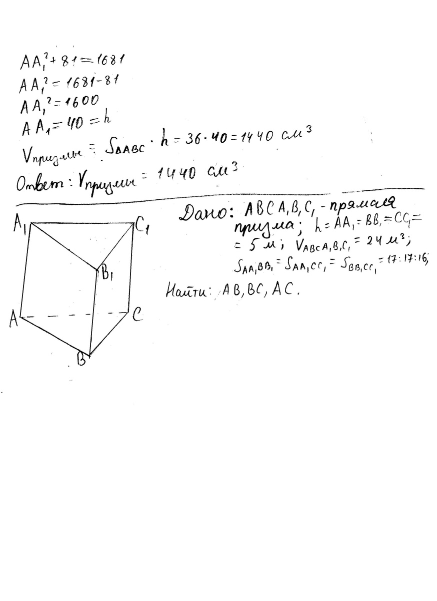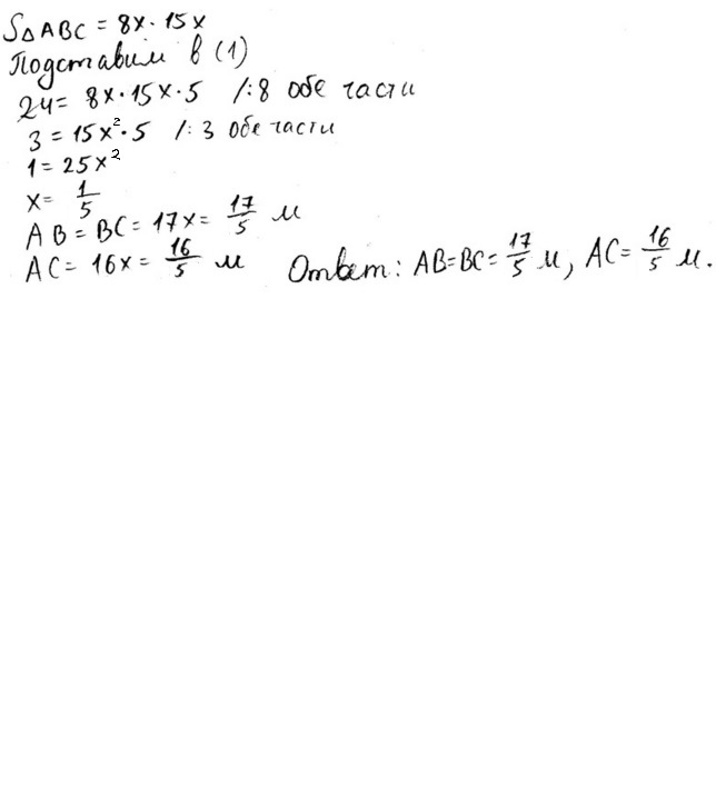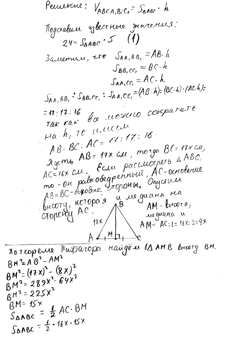 Высота прямой треугольной призмы равна 5 м, а площади боковых граней относятся как 17:17:16. Найдите стороны основания призмы, если ее объем равен 24 м3
