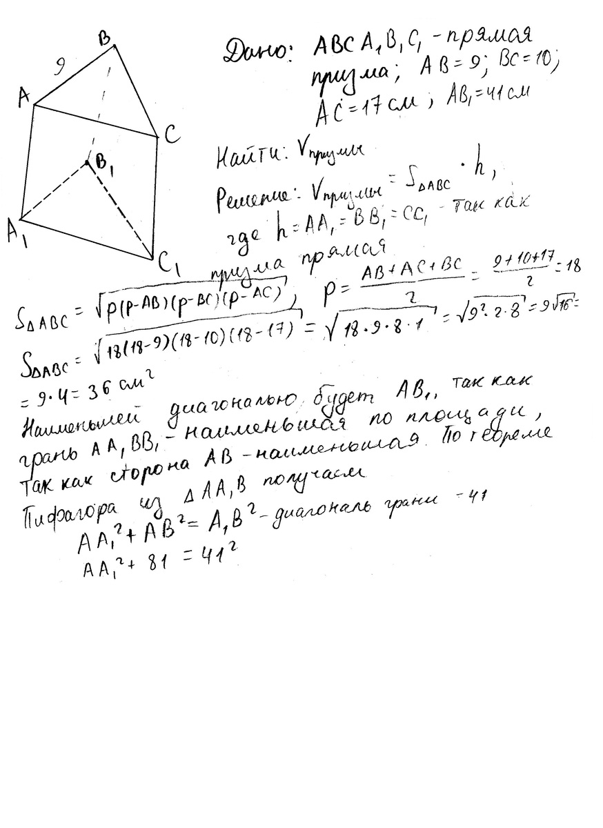 В основе прямой призмы лежит треугольник со сторонами 9 см, 10 см и 17 см. Найдите объем призмы, если диагональ малейшей боковой грани равна 41 см.