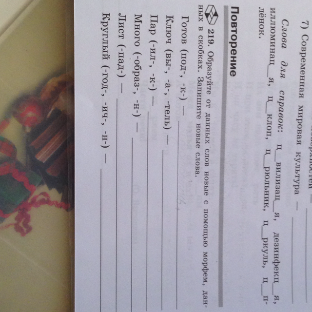 Образуйте от данных слов новые с помощью морфем, данных в скобках. Готов(под-. -к-); ключ(вы-, -a-, -тель); пар(-ил-, -к-)