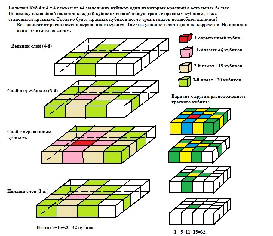 Большой куб 4*4*4 сложен из 64 маленьких кубиков, один из которых красный, а остальные белые. По взмаху волшебной палочки каждый белый кубик, имеющий