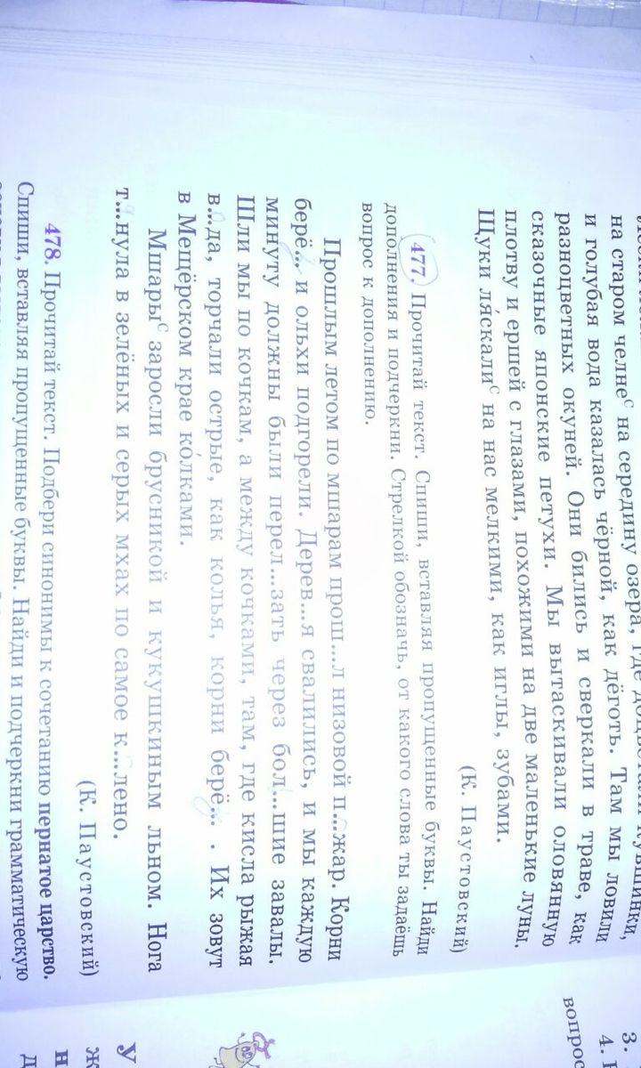 Прошел( по чему?) по мшарам. Корни (чего?) берёз и ольхи. Перелезать через (что?) завалы. Между (чем?) кочками, острые как (что?) колья, корни(чего?) берёз. Заросли (чем?) брусникой и льном. Тонула в( чём?) мхах