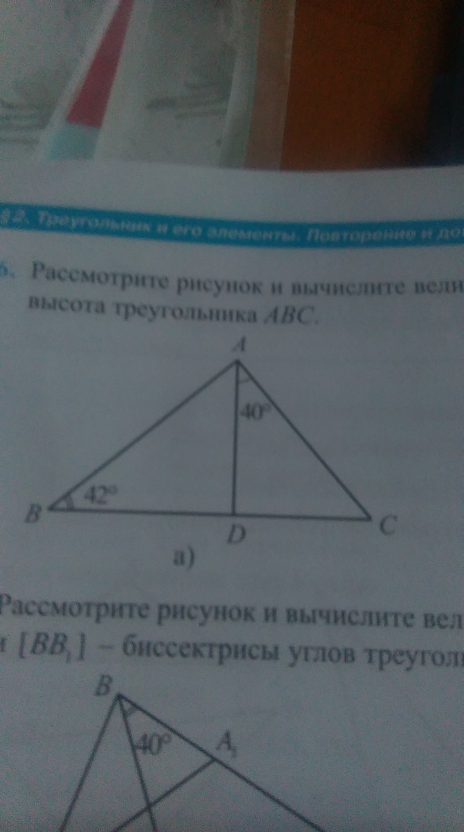 "Рассмотрите рисунок и вычислите величину угла А треугольника АВС, если АD - высота треугольника АВ