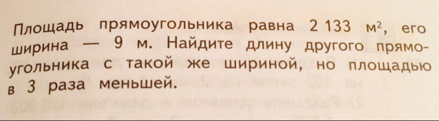 (2133:3):9 при первом действии в скоьках ты найдёшь площадь второго прямоугольника, а вторым действием деление на 9 ты найдешь его длину