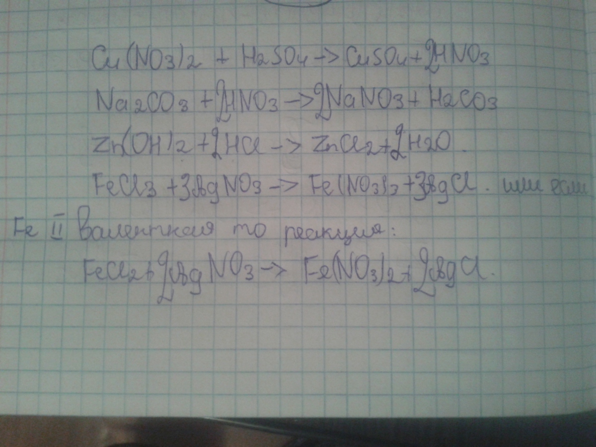 Составить уравнение реакций в молекулярном и ионных видах : Нитрат меди (2)+серная кислота - Карбонат натрия + азотная кислота - Гидроксид цинка + соляная кислота - Хлорид железа + нитрат серебра -
