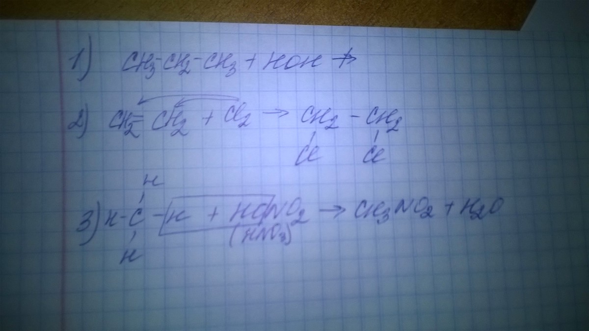 Написать уравнения реакция взаимодействия 1)пропана с водой 2)этилен с молекулой хлора 3) метана с азотной кислотной