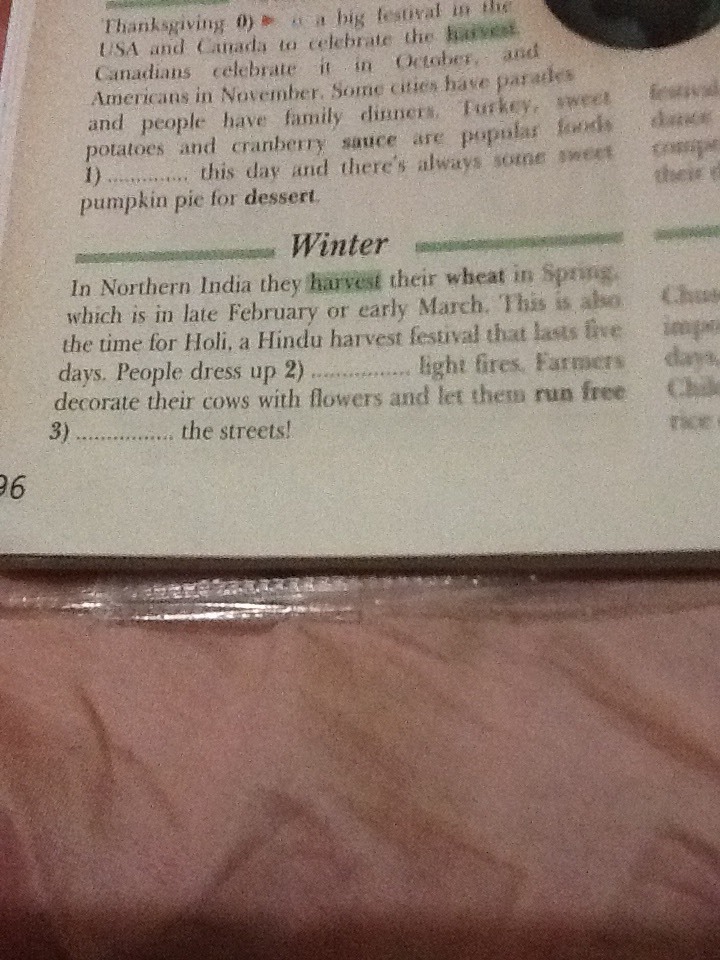 Винтер Ин Норзен Индиа зей хавест зеир вэат ин спринг,вич ис ин лэйт Фебрури о оли Марч.Зис ис олсо зе тайм фо Холи, э Нинди хэвест фестивал зэт ластс файв дэйс.Рирл дрес ап энд лайт фаерс.Фамес десорэйт зеир ковс виз флаурс энд лэт зем ран фри ин зе стритс.