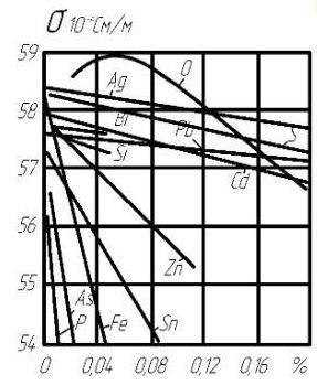 При наличии даже незначительного количества примесей уменьшается электропроводность металлов (следовательно - увеличивается их сопротивление). Электропроводность алюминия ниже электропроводности меди. но при добавлении в алюминий меди, атомы алюминия беспорядочно замещаются атомами меди и потенциал решетки не сохраняется чисто периодическим. Такое нарушение приводит к рассеиванию носителей и дополнительному электрическому сопротивлению. На рисунке показан график зависимости проводимости алюминия от процентного содержания в чистом металле примесей разных металлов.