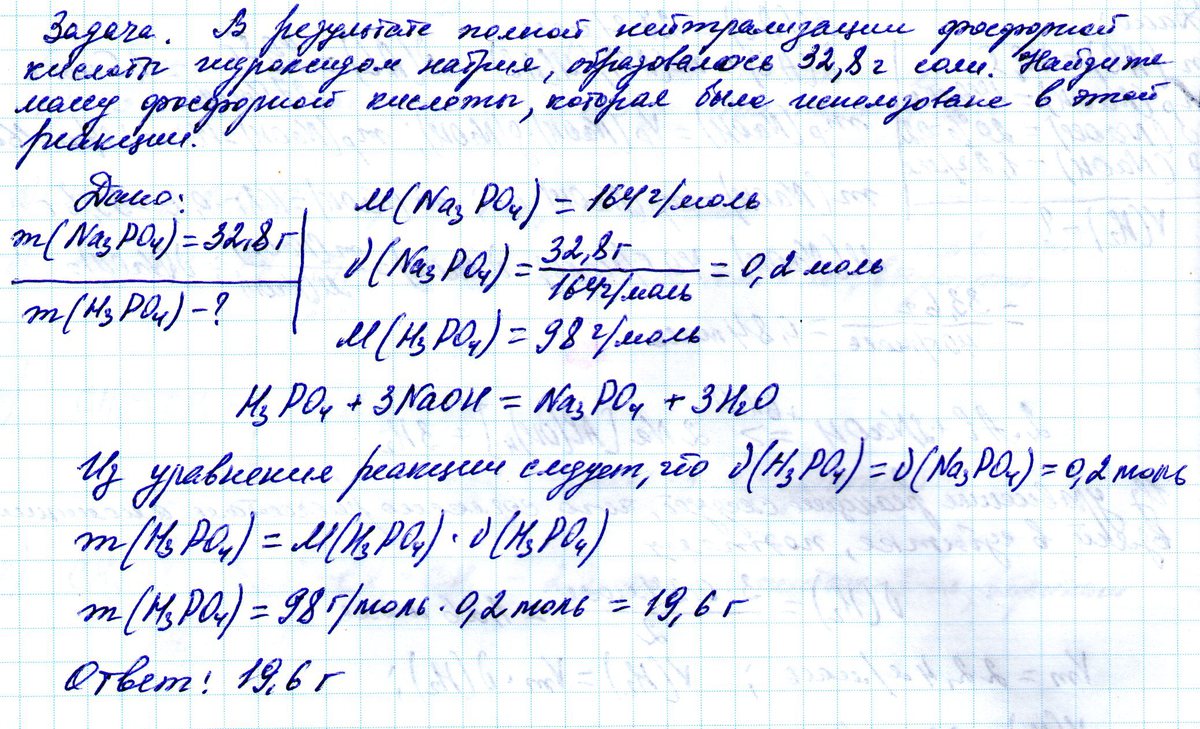 придумать условие задачи при решении которой необходимо использовать приведенное ниже уравнение и решить ее:H3PO4+3NaOH=Na3PO4+3H2O