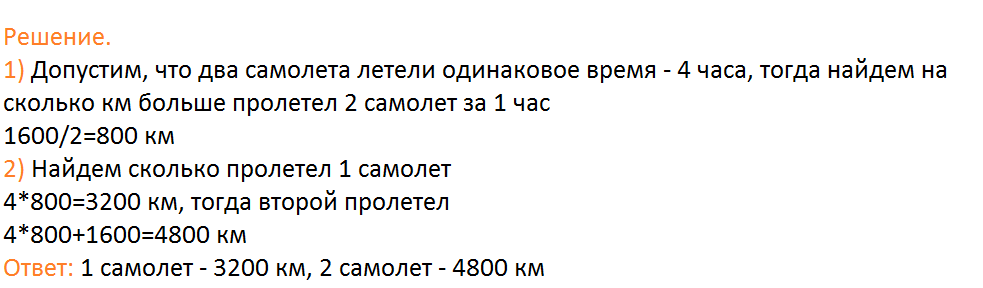 Два самолёта летели с одинаковой скоростью. Один самолёт был в воздухе 4 ч., а другой-6 ч и пролетел на 1600 км больше, чем первый. Сколько км пролетел каждый самолёт?