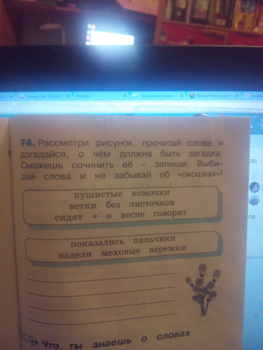 Показала верба почки-пальчики и надела на них меховые варежки . У нее цветочки- пушистые комочки ,ветки без листочков .