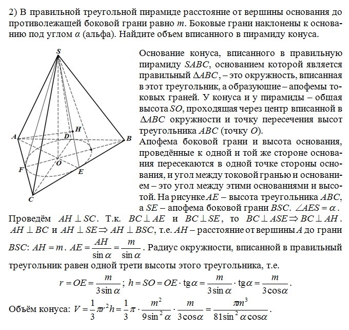 2) В правильной треугольной пирамиде расстояние от вершины основания до противолежащей боковой грани= m. Боковые грани наклонены к основанию под углом a (альфа). Найдите объем, вписаного в пирамиду конуса