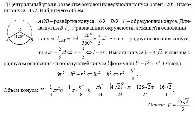 1) Центральный угол в развертке боковой поверхности конуса равен 120°. Высота конуса=4√2. Найдите его объем.