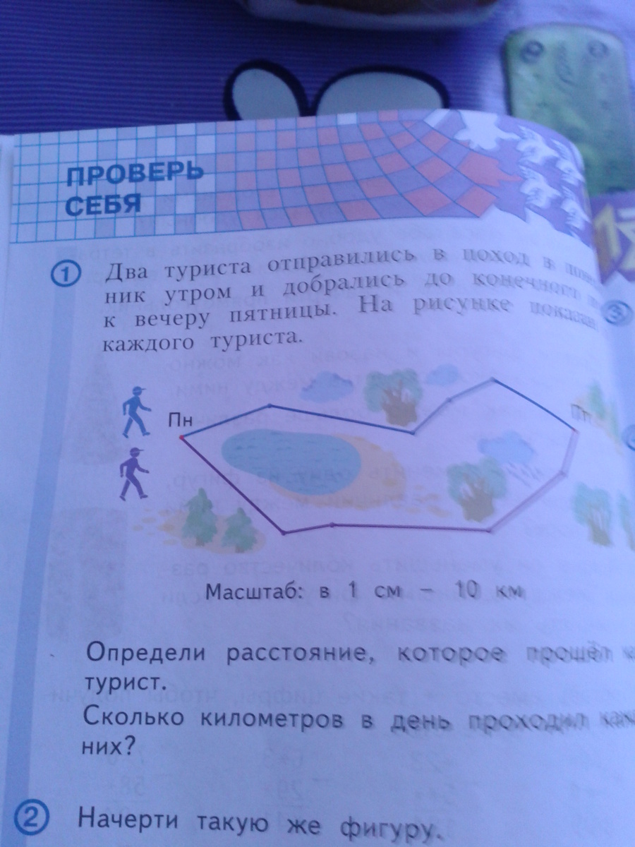 решите задачу плиззззззз. Два туриста отправились в поход в понедельник утром и добрались до конечного пункта к вечеру пятницы. На рисунке показан путь каждого туриста. Определите расстояние, которое прошел каждый турист. Сколько километров в день проходил каждый из них?