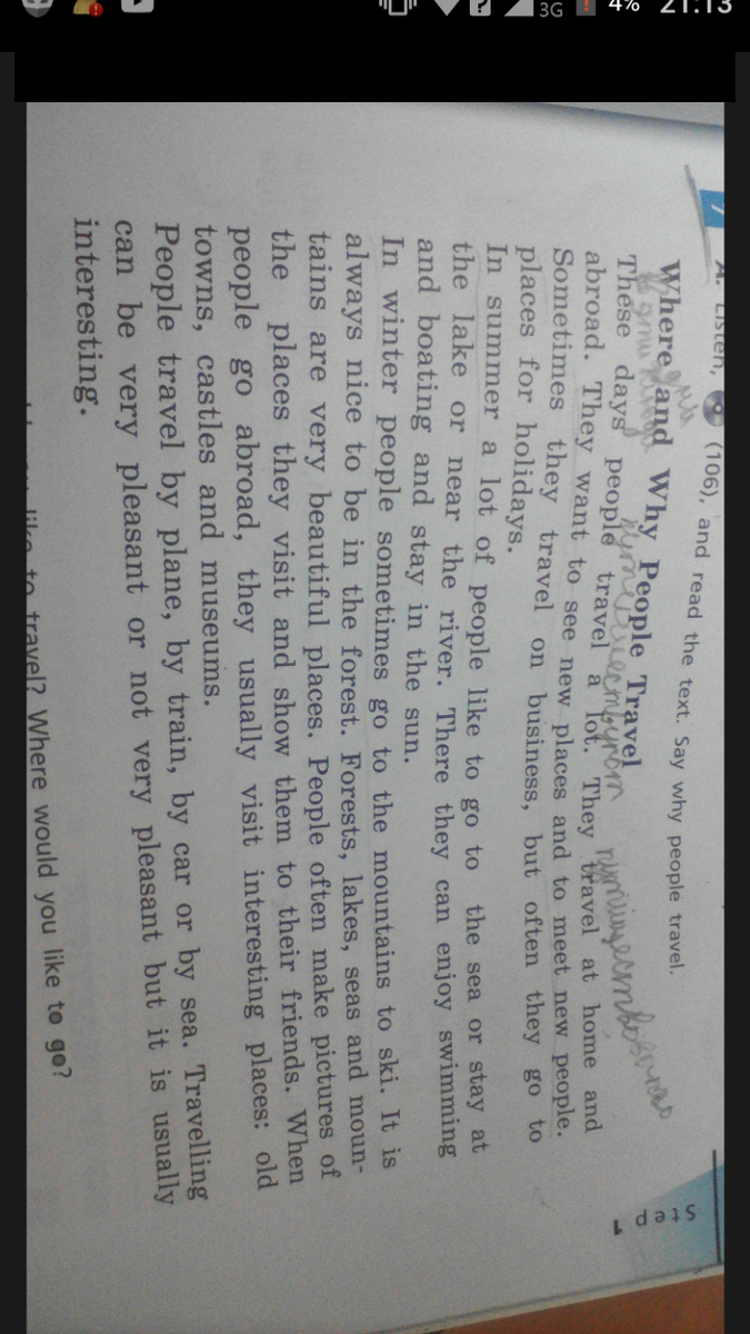 Люди путешествуют на самолете, на поезде, на машине или по морю. Путешествия могут быть приятными и не очень приятными, но обычно интересными.