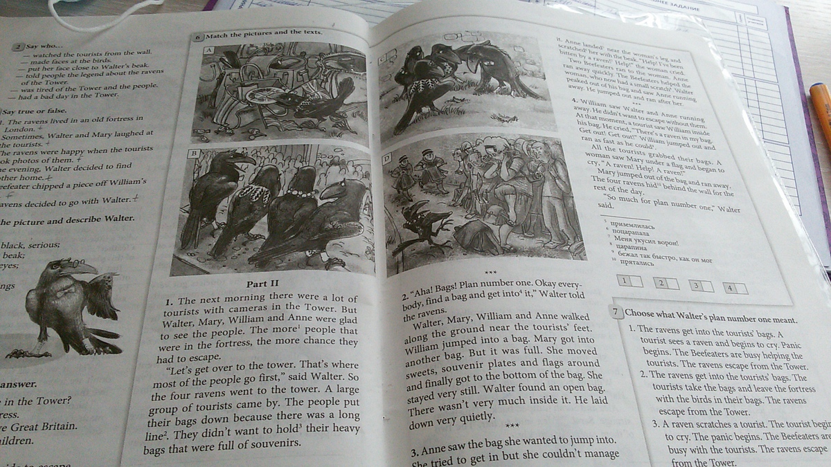 1)На следующее утро было много туристов с камерами в буксирного Но Уолтер, Мэри, Уильяма и Энн были, что видят люди. Чем больше шансов было в крепости, тем больше пришлось бежать. где "Давайте перейдем к башне. Это большинство людей шли в первую очередь," сказал Уолтер. Таким образом, четыре вороны пошли к башне.