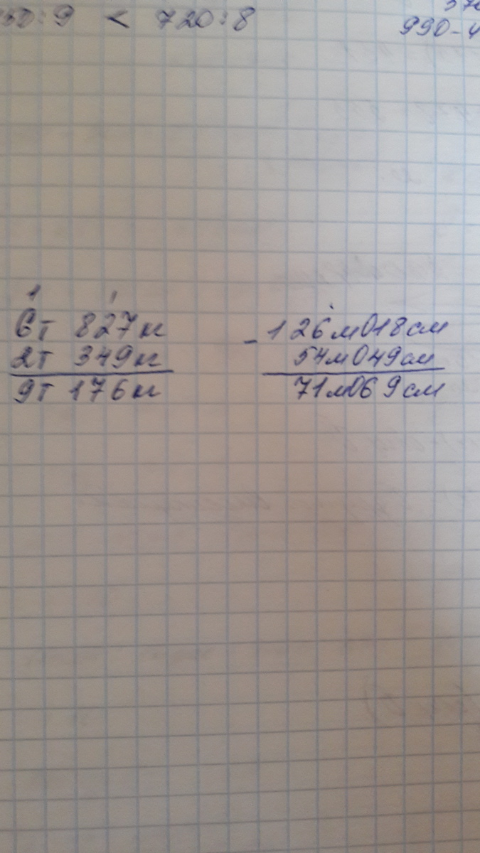 :6т827кг+2т349кг=6827+2349=9176кг=9т176кг 126м18см-54м49см=12618-5449=7169см=71м69см