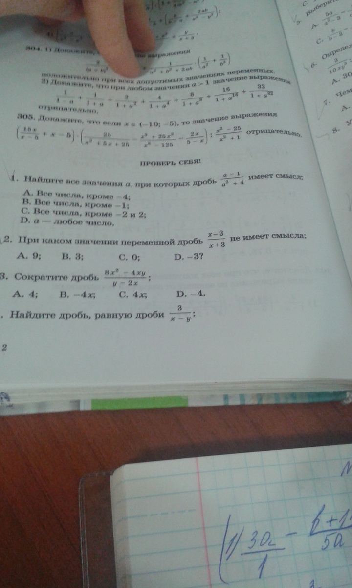 1) - Д; 2) - Д; 3)В; надо смотреть, при каких х знаменатель будет=0., 1) а^2 всегда положительное число или 0, но даже при а=0 прибавляем 4 и знаменатель при любом а не =0))))