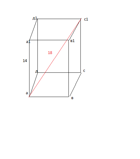 В правильный четырехугольный призме боковое ребро равно 14см, а диагональ равна 18см. Найти объём призмы