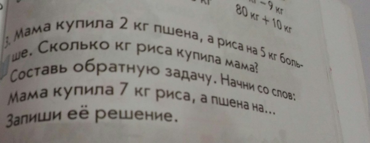 Мама купила 7 кг риса,а пшена на 5 кг меньше.Сколько кг пшена купила мама?