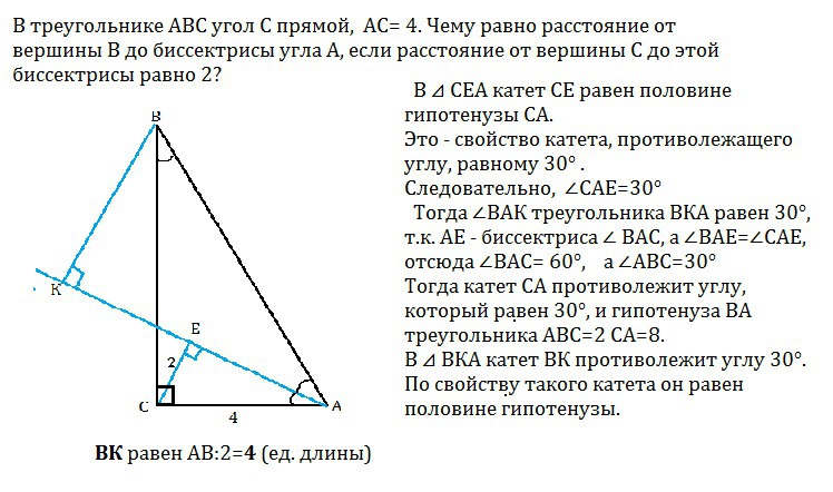 В треугольнике abc угол c прямой ac 4. Чему равно расстояние от вершины В до биссектрисы угла А .если расстояние от вершины С до этой биссектрисы равно 2