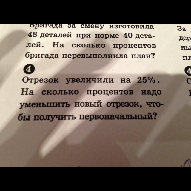 От резок увеличили на 25%. На сколько процентов надо уменьшить новый отрезок, чтобы получить первоначальный?