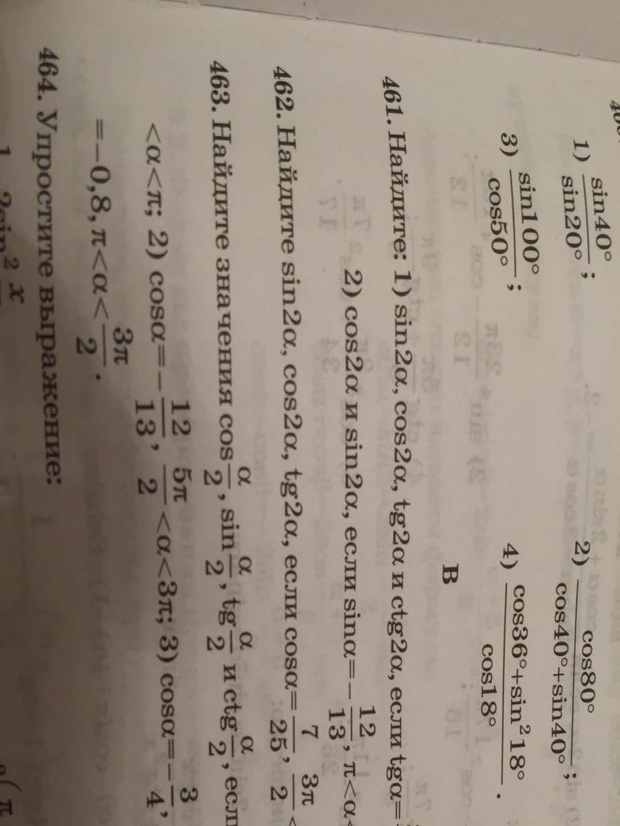 461 номер. Найдите sin2альфа, cos2альфа, tg2альфа, и ctg2альфа, если tgальфа=3/4, 180'<альфа<270'; cos2альфа и sin2альфа, если sinальфа=-12/13, Пи<альфа<2Пи