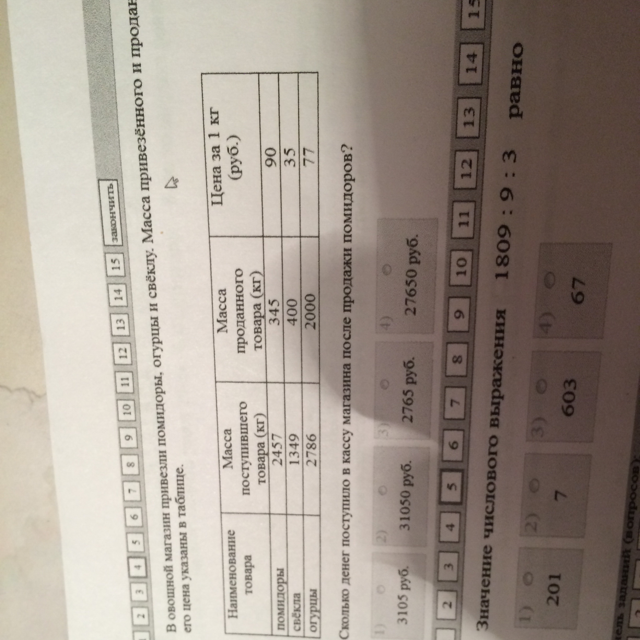 В овощной магазин привезли помидоры , огурцы и свёклу . Массы привезённого и проданного товара и его цена указана в таблице. Сколько денег поступила в кассу магазина после продажи помидоров ?